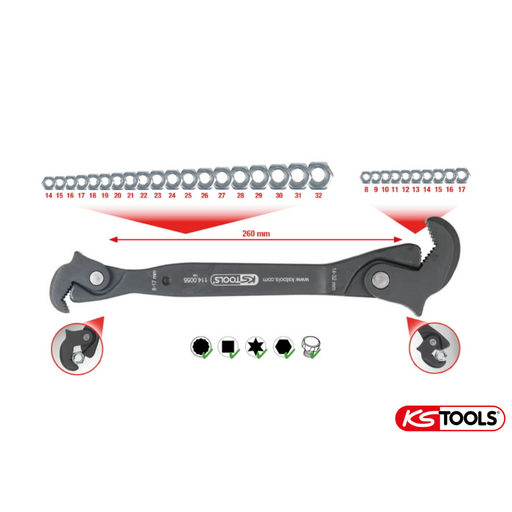 KS-ToolsHinnat € / alv0% Kätevä monitoimavain räikkätoiminnolla. Yhden käden yleisavain laaja käyttöalue 8-32 mm.